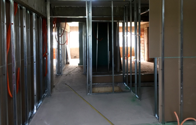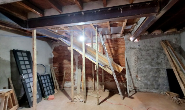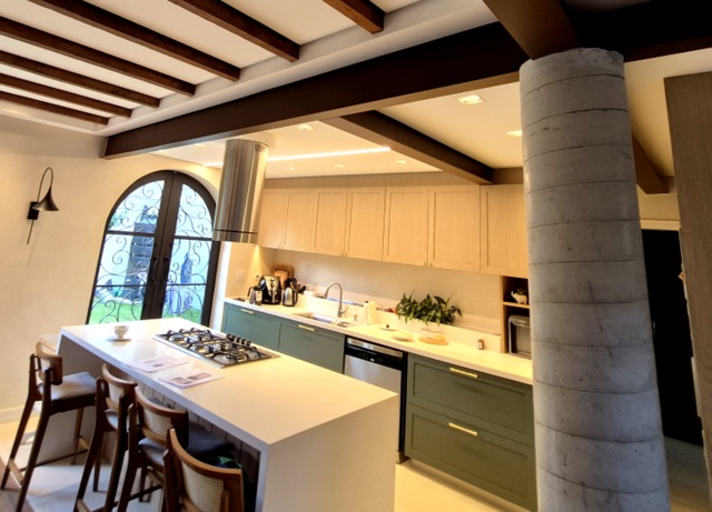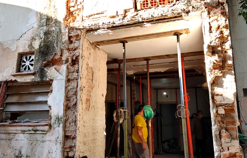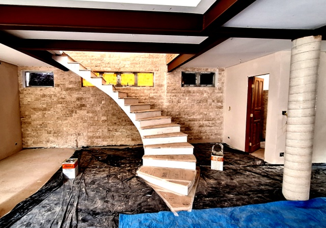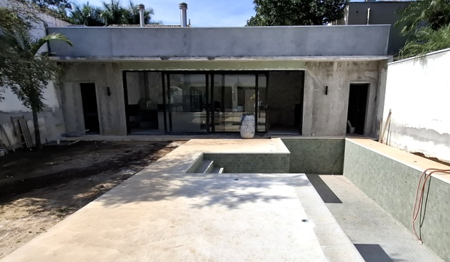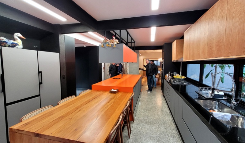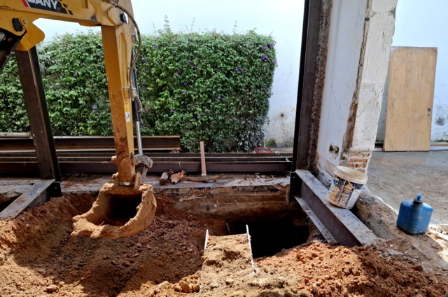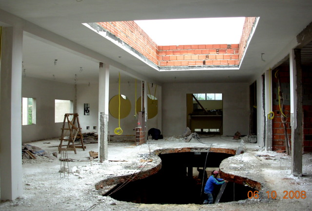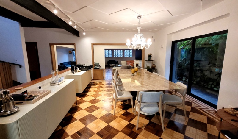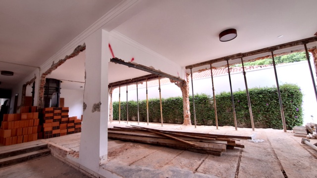Casa antiga no Pacaembu preservadas as paredes externas de tijolos maciços e refeito todo o interior, demolindo paredes estruturando com estrutura metálica, inclusive escavando e ampliando o subsolo.