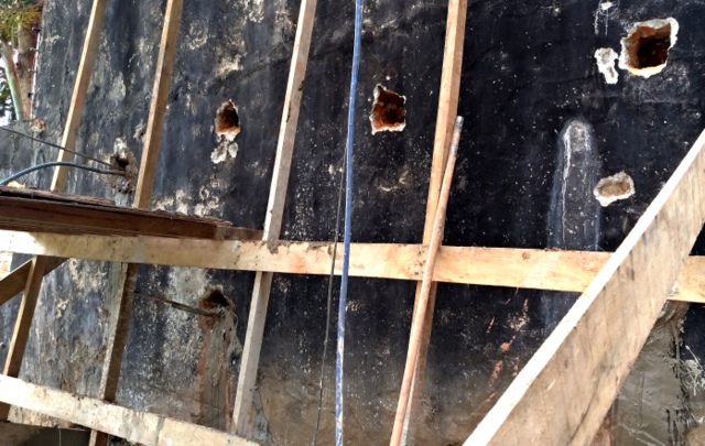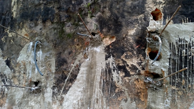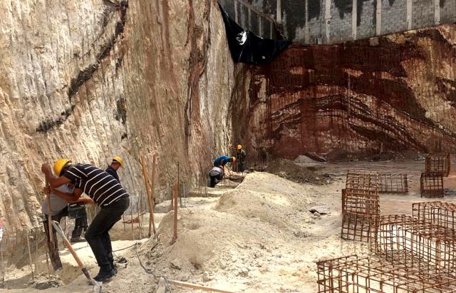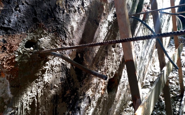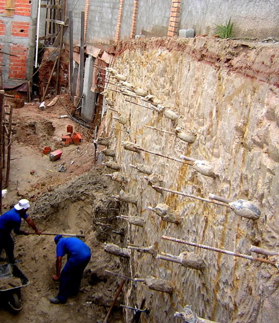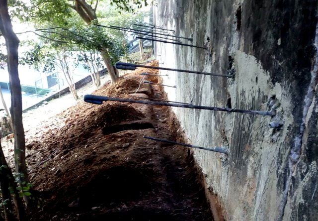 Técnica mista flexão e solo grampeado executado com logística criativa começando por cima e por baixo, mitigando riscos.